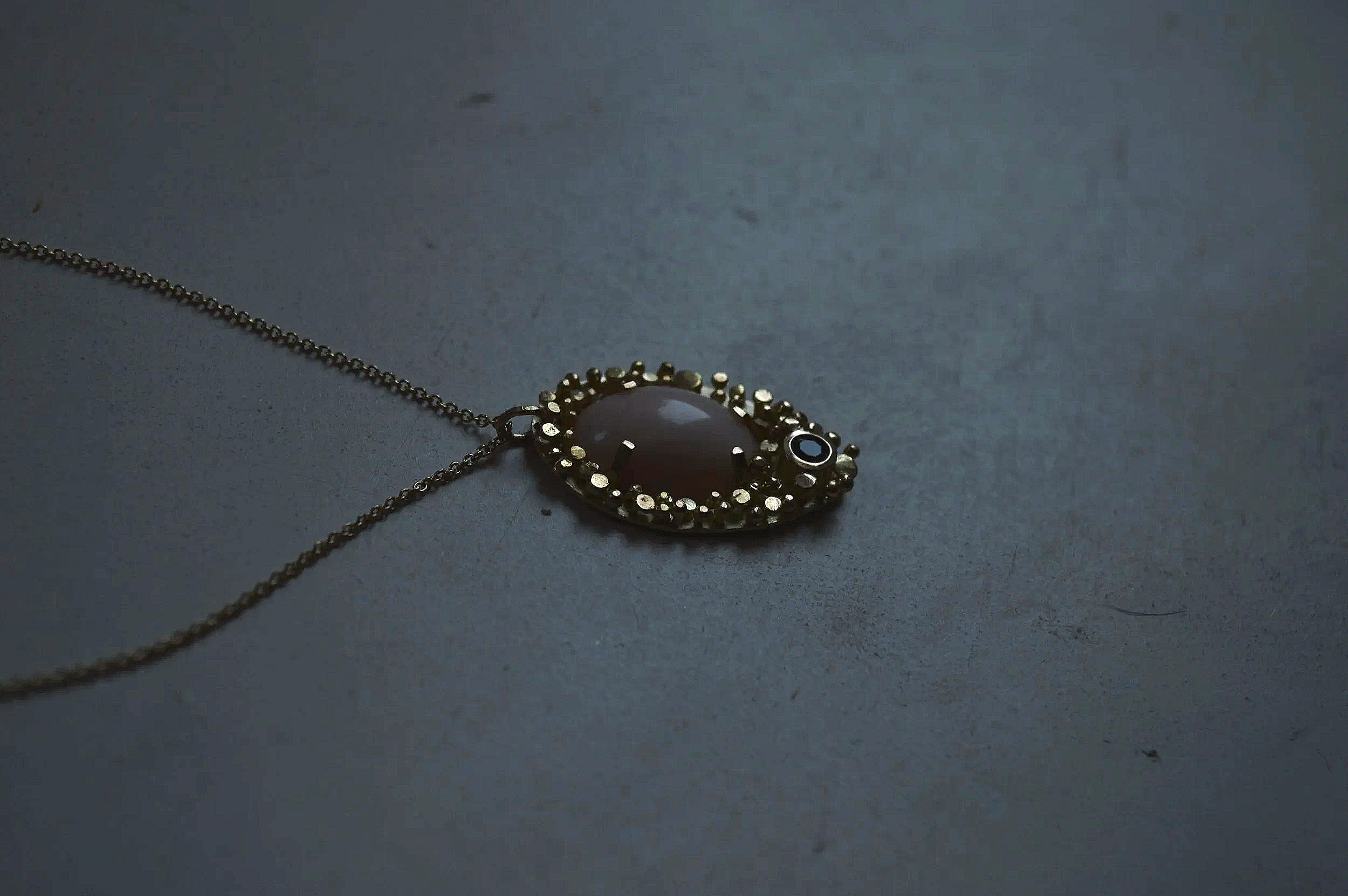 Un joyel en oro de 18 quilates donde un coral “piel de ángel” y una tsavorita son abrazados y protegidos por un halo de hilos de oro. Unos “filamenti” que la otorgan de un volumen y una textura únicos, donde la luz se refleja a su antojo.